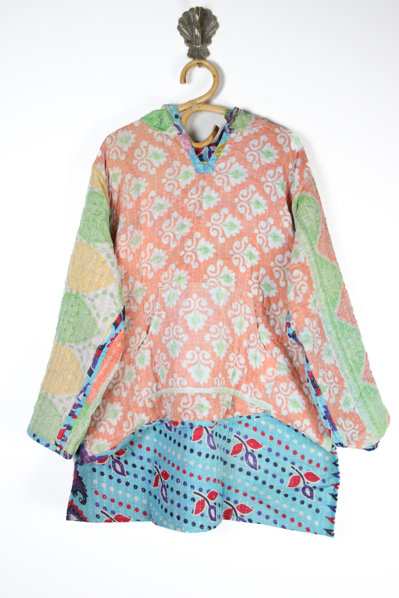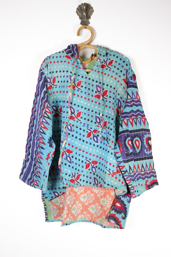 Crafted from soft 3-layer Indian cotton kantha fabrics, every hoodie is truly one-of-a-kind. Long sleeves, a hi-lo hemline, a big roomy hood and a front pocket inside and out because, did we mention? They're fully reversible! So it’s basically two hoodies in one!