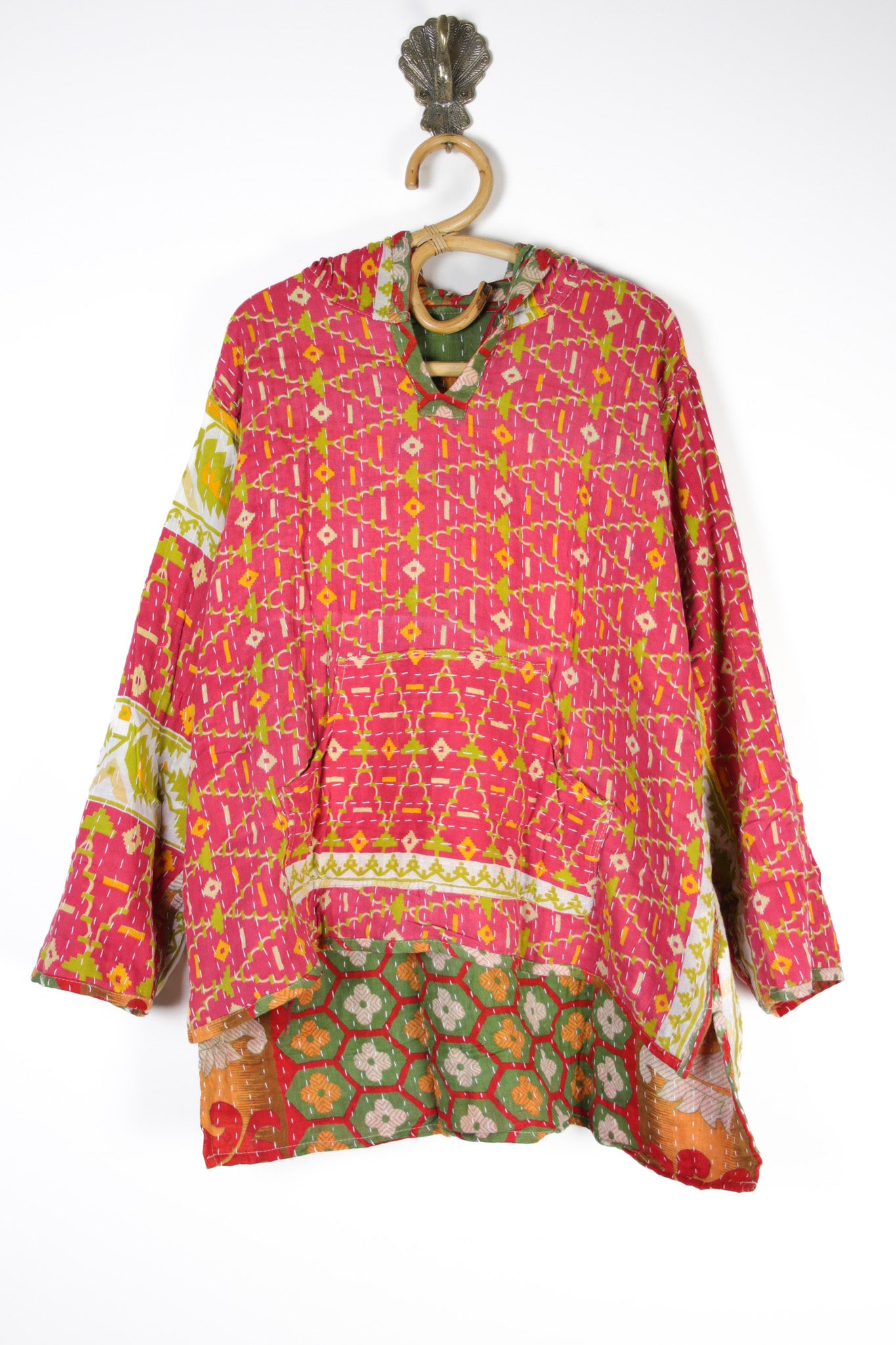 Crafted from soft 3-layer Indian cotton kantha fabrics, every hoodie is truly one-of-a-kind. Long sleeves, a hi-lo hemline, a big roomy hood and a front pocket inside and out because, did we mention? They're fully reversible! So it’s basically two hoodies in one!