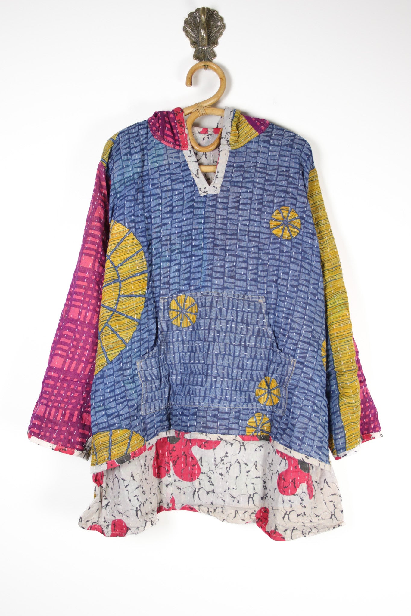 Crafted from soft 3-layer Indian cotton kantha fabrics, every hoodie is truly one-of-a-kind. Long sleeves, a hi-lo hemline, a big roomy hood and a front pocket inside and out because, did we mention? They're fully reversible! So it’s basically two hoodies in one!