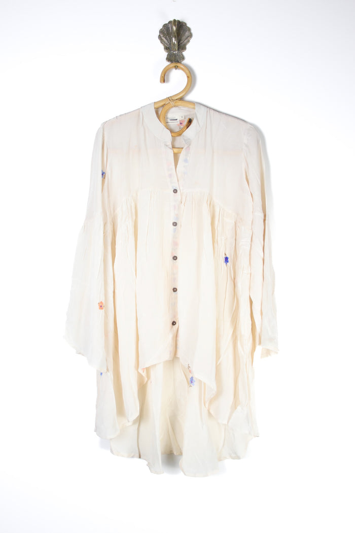 The details are everything; wide, billowy sleeves and a button-up front with the cutest wooden buttons. This batch has the most delightful hand-embellishments - embroidery, beadwork, block prints...and that point detail on the back and sleeves? Love! The hi-lo hem makes it perfect for layering too, wear it buttoned up or open like a robe.