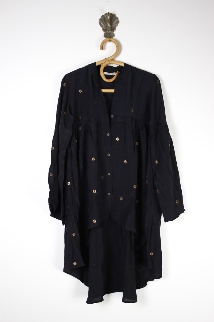The details are everything; wide, billowy sleeves and a button-up front with the cutest wooden buttons. This batch has the most delightful hand-embellishments - embroidery, beadwork, block prints...and that point detail on the back and sleeves? Love! The hi-lo hem makes it perfect for layering too, wear it buttoned up or open like a robe.