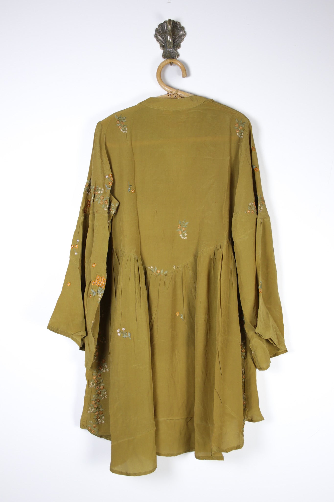 The details are everything; wide, billowy sleeves and a button-up front with the cutest wooden buttons. This batch has the most delightful hand-embellishments - embroidery, beadwork, block prints...and that point detail on the back and sleeves? Love! The hi-lo hem makes it perfect for layering too, wear it buttoned up or open like a robe.