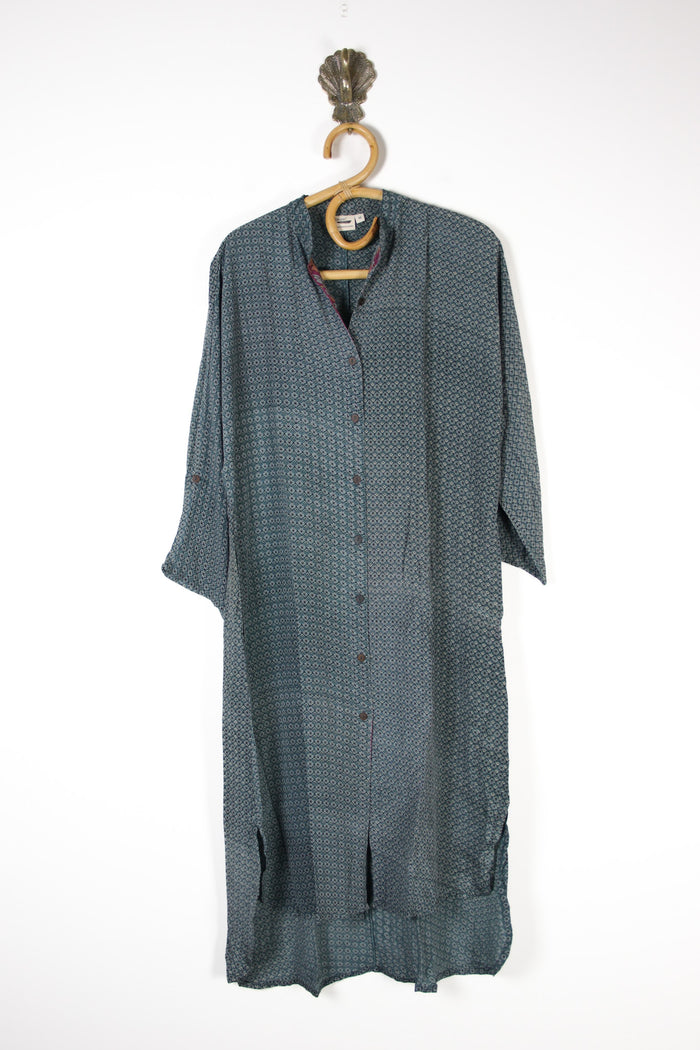 Light as air and full of soul, our Jasmine Shirtdress is made from recycled Indian silk saris, each one entirely one of a kind. Designed with a hi-lo hem, 3/4 sleeves and button-through front, it moves beautifully whether worn open or closed. The Nehru collar adds a subtle nod to classic Indian tailoring, while the maxi length brings that effortless drape we love.