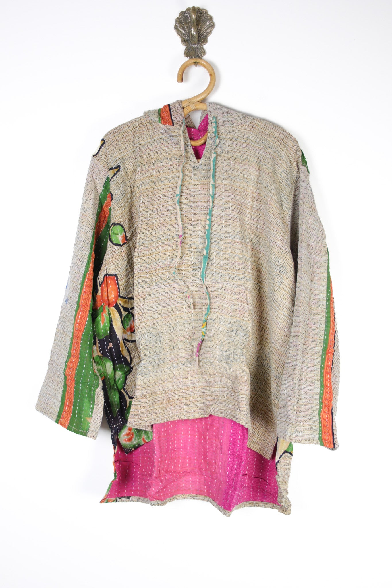 Crafted from soft 3-layer Indian cotton kantha fabrics, every hoodie is truly one-of-a-kind. Long sleeves, a hi-lo hemline, a big roomy hood and a front pocket inside and out because, did we mention? They're fully reversible! So it’s basically two hoodies in one!