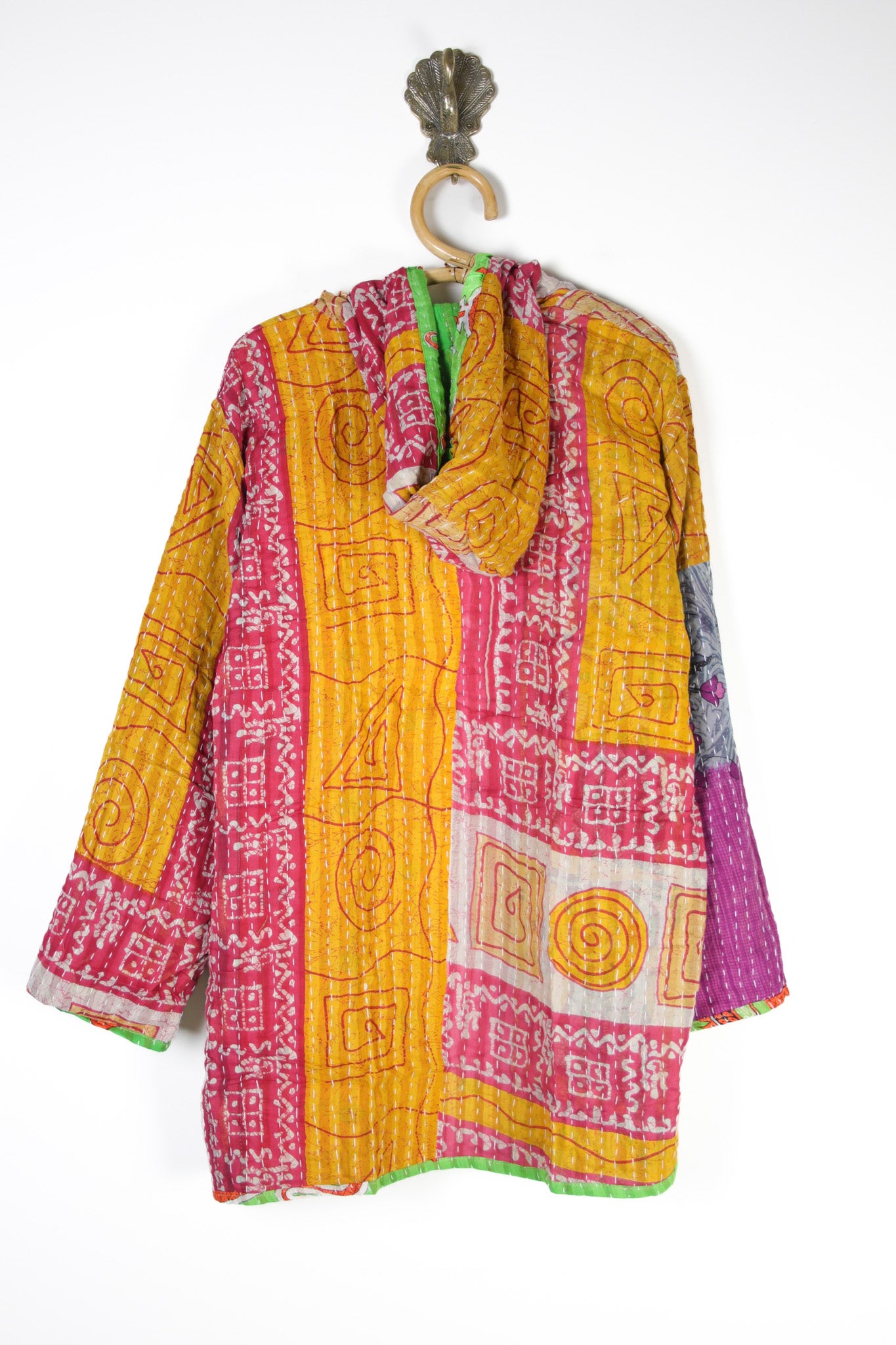 Crafted from soft 3-layer Indian cotton kantha fabrics, every hoodie is truly one-of-a-kind. Long sleeves, a hi-lo hemline, a big roomy hood and a front pocket inside and out because, did we mention? They're fully reversible! So it’s basically two hoodies in one!