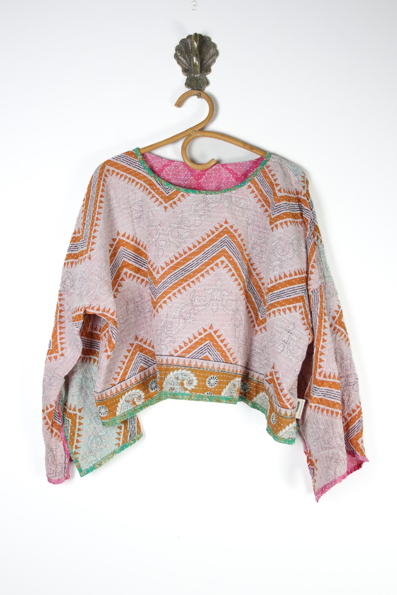 'Saral' is simple or easygoing in Hindi. These are made from upcycled cotton kantha and 100% reversible so you get 2 tops in 1. They have long sleeves, a wide neckline and are the perfect cropped length to wear with our high waist pants. Super comfy and versatile, each one is a treasure.