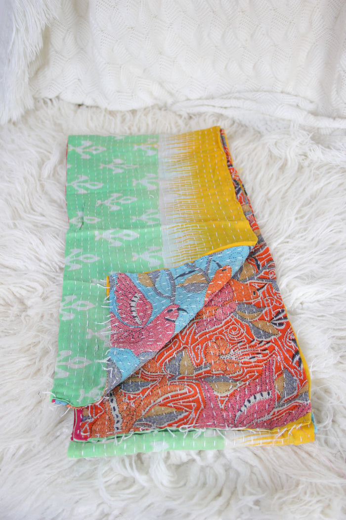 Our Vagabond Kantha Scarves are made from hand-stitched Indian cotton kantha. They each have a different pattern and colourway on either side, so no two scarves are ever the same.