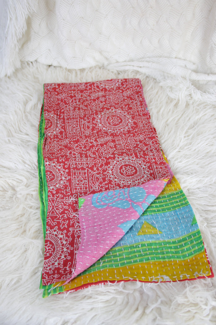 Our Vagabond Kantha Scarves are made from hand-stitched Indian cotton kantha. They each have a different pattern and colourway on either side, so no two scarves are ever the same.