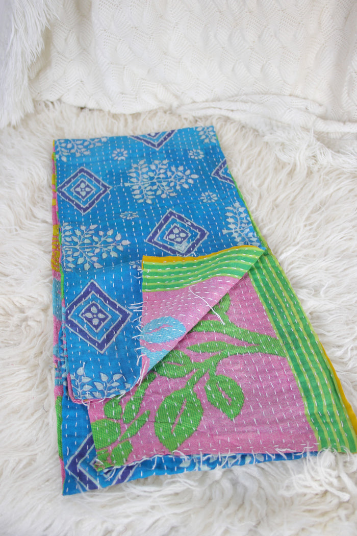 Our Vagabond Kantha Scarves are made from hand-stitched Indian cotton kantha. They each have a different pattern and colourway on either side, so no two scarves are ever the same.