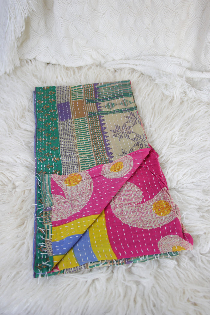 Our Vagabond Kantha Scarves are made from hand-stitched Indian cotton kantha. They each have a different pattern and colourway on either side, so no two scarves are ever the same.