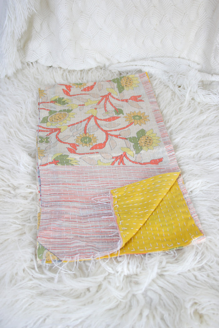 Our Vagabond Kantha Scarves are made from hand-stitched Indian cotton kantha. They each have a different pattern and colourway on either side, so no two scarves are ever the same.