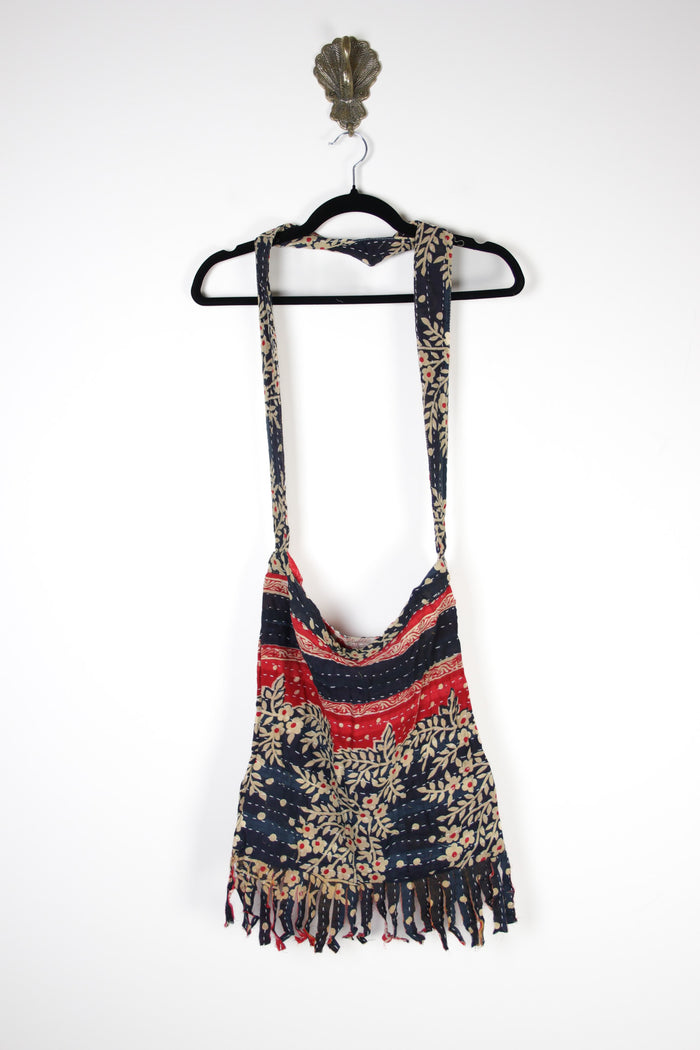 They're nice and roomy so you can throw LOTS inside, the strap is long enough to wear either over your shoulder or as a cross-body bag. They have a kantha fringe along the bottom and handy inside pocket too.