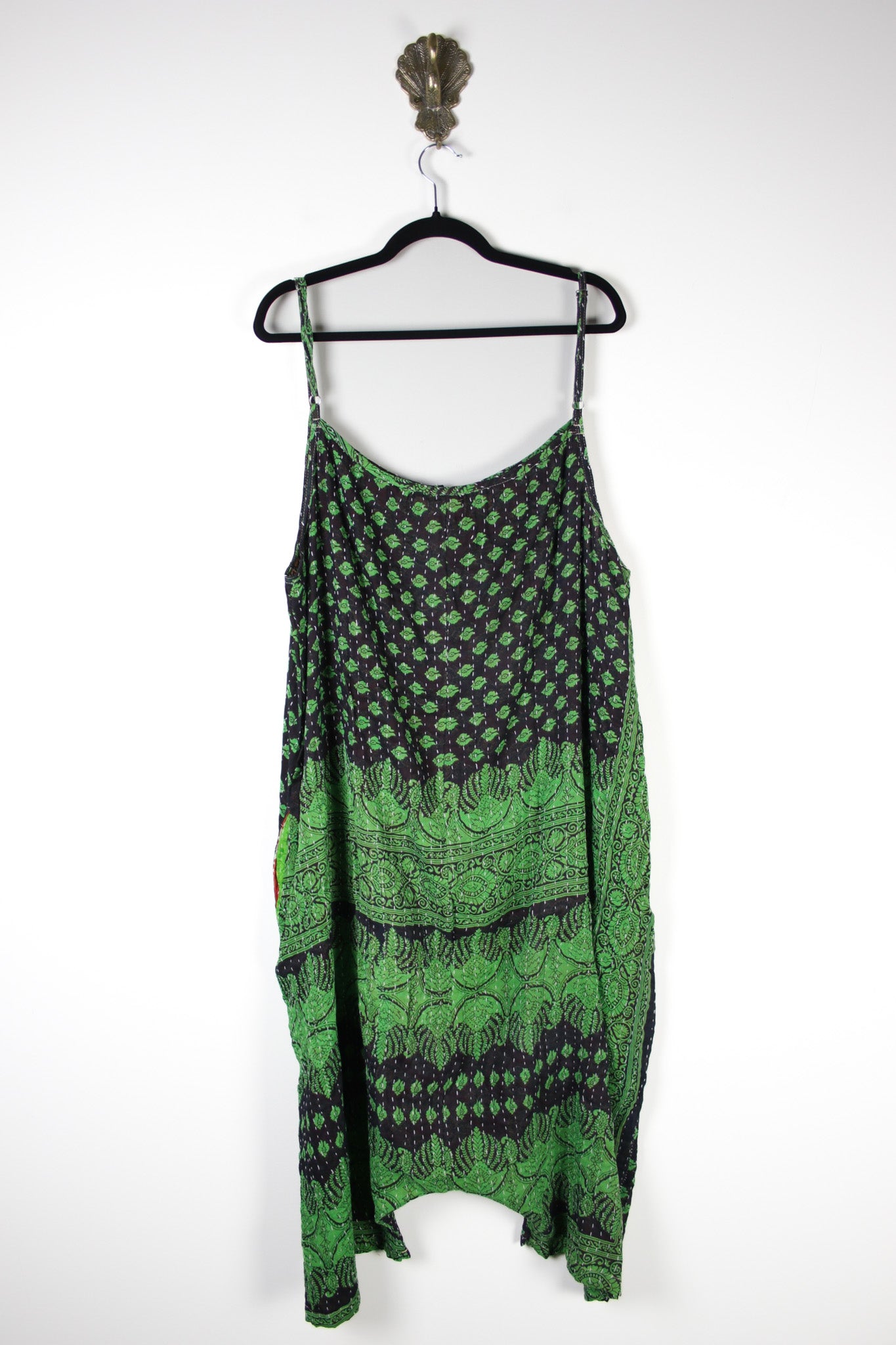The Asha Romper - crafted from recycled Indian cotton Kantha, making each one completely one of a kind. It has adjustable straps, functional buttons on the bodice, hidden pockets and a relaxed drop-crotch with an oversized fit.