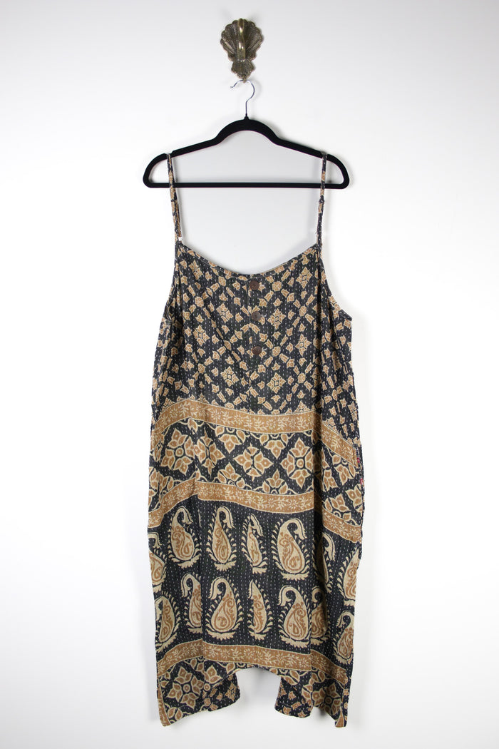 The Asha Romper - crafted from recycled Indian cotton Kantha, making each one completely one of a kind. It has adjustable straps, functional buttons on the bodice, hidden pockets and a relaxed drop-crotch with an oversized fit.