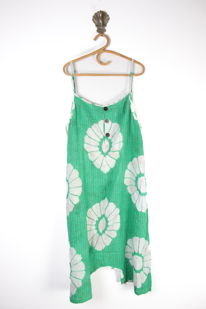 The Asha Romper - crafted from recycled Indian cotton Kantha, making each one completely one of a kind. It has adjustable straps, functional buttons on the bodice, hidden pockets and a relaxed drop-crotch with an oversized fit.