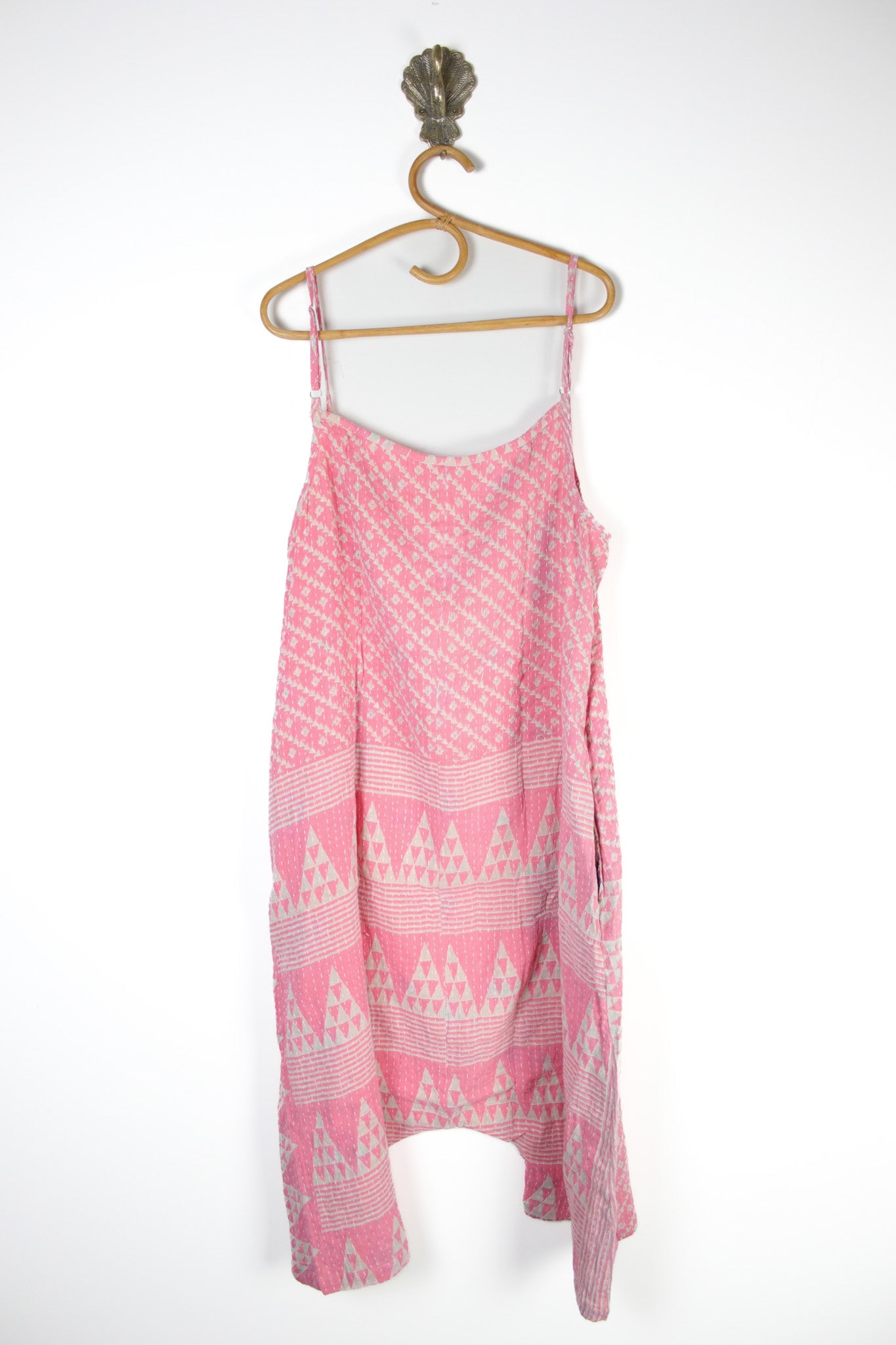 The Asha Romper - crafted from recycled Indian cotton Kantha, making each one completely one of a kind. It has adjustable straps, functional buttons on the bodice, hidden pockets and a relaxed drop-crotch with an oversized fit.