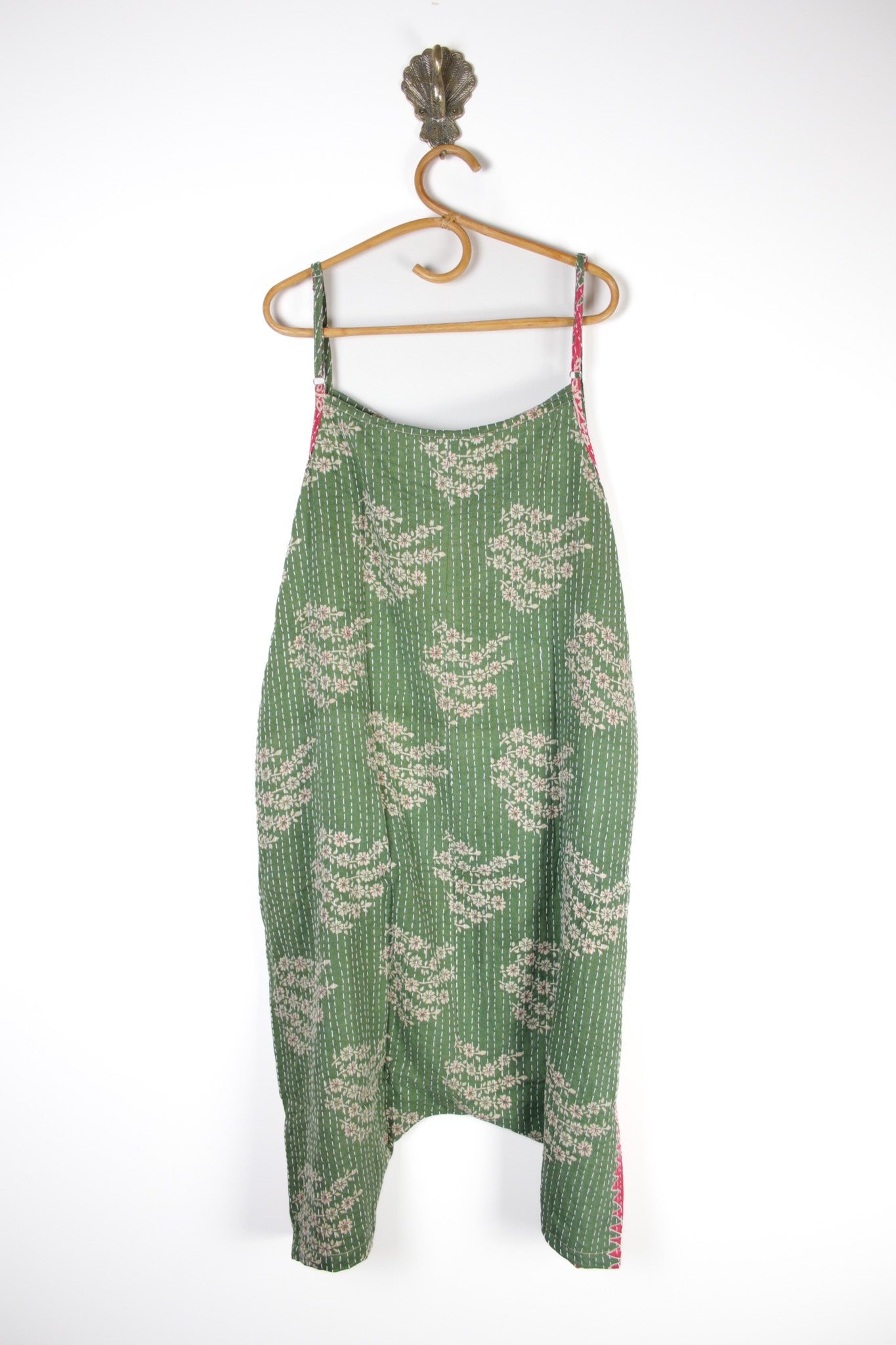 The Asha Romper - crafted from recycled Indian cotton Kantha, making each one completely one of a kind. It has adjustable straps, functional buttons on the bodice, hidden pockets and a relaxed drop-crotch with an oversized fit.