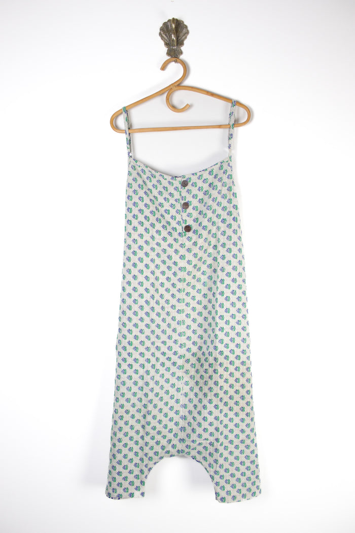 The Asha Romper - crafted from recycled Indian cotton Kantha, making each one completely one of a kind. It has adjustable straps, functional buttons on the bodice, hidden pockets and a relaxed drop-crotch with an oversized fit.