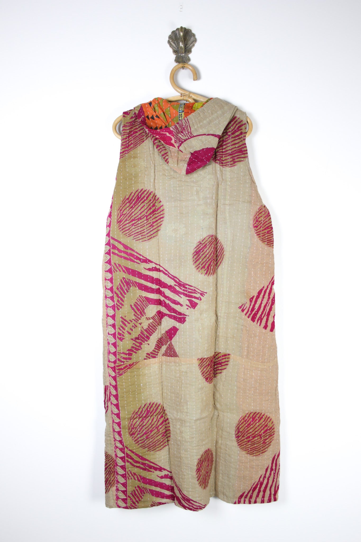 Made from upcycled 3-layer Indian cotton kantha, each vest is completely one-of-a-kind, with its own story stitched into every pattern. It features big patch pockets (perfect for all your essentials), a roomy hood, and—best of all—it’s fully reversible. Because who doesn’t love two looks in one?